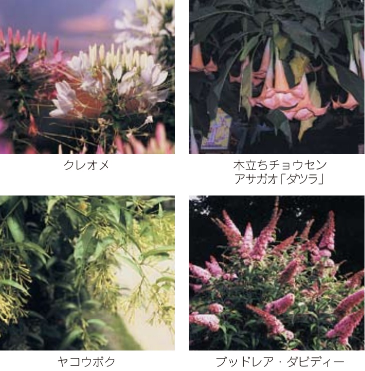 万葉集にも詠われているように植物には夏場に多い、夜咲き、夜に香る草花は随分多い。淡路花博で成功したナイトガーデンも、人々の情緒を育む深みのある目覚めをガーデニングに求める一つのきっかけにしてはどうなのか。ユウガオ、クレオメ、オシロイバナ、ヘチマ、ヒョウタン、コダチ性チョウセンアサガオ(ダツラ)、ヤコウボク、サンユウカ、ジャスミン類、ハマナス、ハマユウと素晴らしい香りが夕暮れから夜にかけて、庭やベランダで放ってくれるのである。ナイターは、サッカーや野球だけでなく、私たちの狭い小庭やベランダで演出できる。寝静まるまでの時間にスポットライトを近隣に迷惑のかからない範囲で照らし、夜咲き香る素晴らしいロマンティックな世界のあることを知ることは、情緒を育くむきっかけとして、今夏やってみることをお奨めする。4時に咲く花としてありふれてはいるがオシロイバナがあるし、時刻を告げてくれるヤコウボクは、瀬戸内では7時になると香り始めるのである。香りが人々の心をなごまし、元気づけることは古い歴史の中にあった。日本の香りの文化は遠く聖徳太子の時代に、南方から紀淡海峡を北に向い兵庫県の淡路島に辿り着いた流木に始まる。ときの漁夫たちが浜辺で流木で焚火をしていると素晴らしい香りが放ち重宝に、ときの宮内庁聖徳太子に献上したと「日本書紀」に明記されているのである。いわゆる沈香で、まさに日本文化の発祥は淡路島だったのである。今日普及している西洋のハーブは燃やすと、天上向いて香りが昇るが、東洋の香りは床に向ってたなびくことを知ってほしい。東洋の五香木とは沈香、乳香、白檀、安息香、天台烏薬である。この中で、この夏場の時期に植木として宝塚の山本あたりで手にすることができるのは、天台烏薬だけである。日本に帰化し、紀伊半島にかなり見られるようであり、植木として販売もしている。