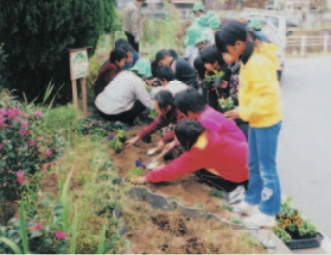 小学生と一緒に植え替え作業