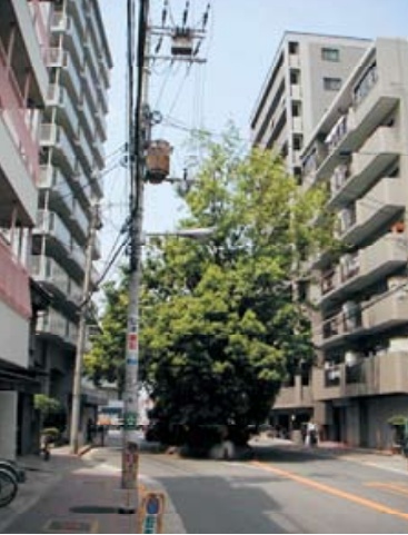 そんな地図に載せてもいいような樹木が、今でも大阪の谷町筋にある。地元では「楠さん」と呼ばれており、注連縄(しめなわ)と樹下の小祠がご神木であることを物語る。高い建物が建ち並ぶ現代の都市にあっては、もはや遠くからでも見えるというわけにはいかないが、道路の真中に樹木が立つ様子は、そこだけ別世界のように異彩を放っている。調べてみると、大阪市内には、こうしたご神木が30本あまりあることがわかった。いずれも地域のシンボルとなるような樹木である。道路敷地に立っていることから「路傍樹」と呼ぶことにした。