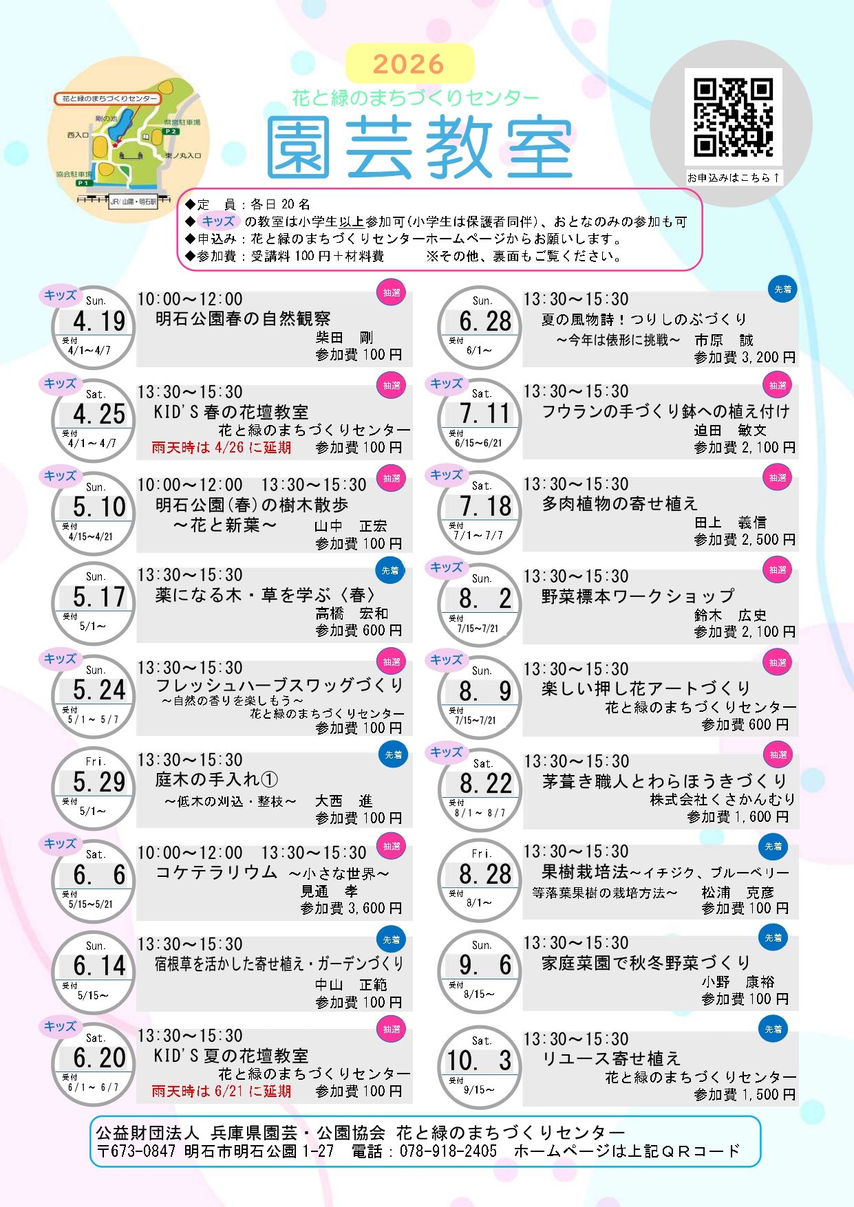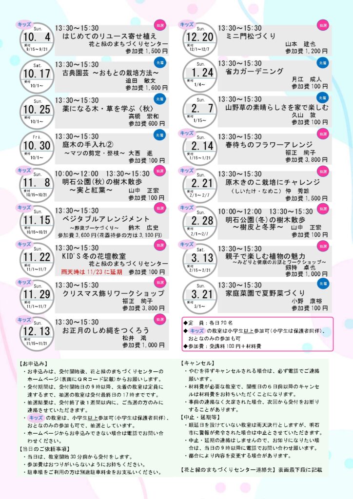 全ての教室は事前申込みが必要です。下記チラシのQRコードを読み取って、花と緑のまちづくりセンターのホームページからお申込みください。
