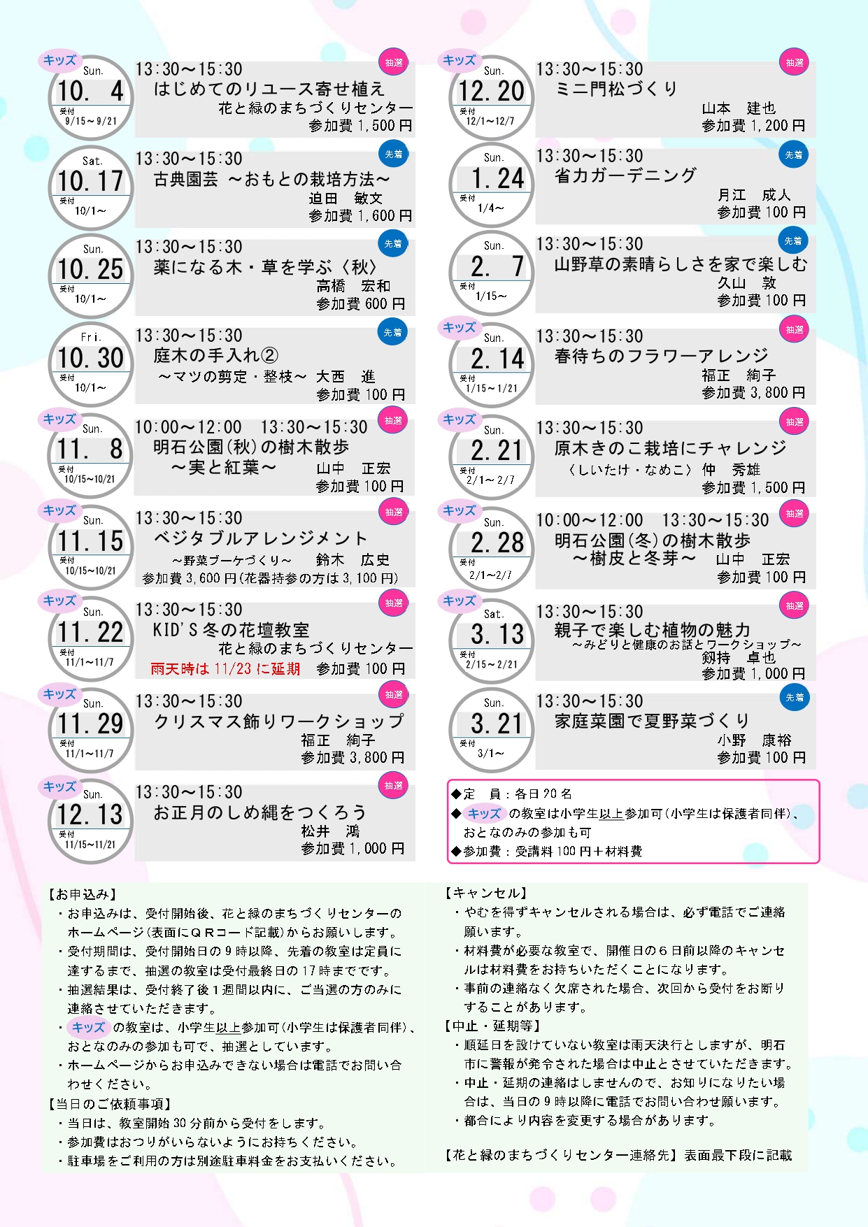 全ての教室は事前申込みが必要です。下記チラシのQRコードを読み取って、花と緑のまちづくりセンターのホームページからお申込みください。